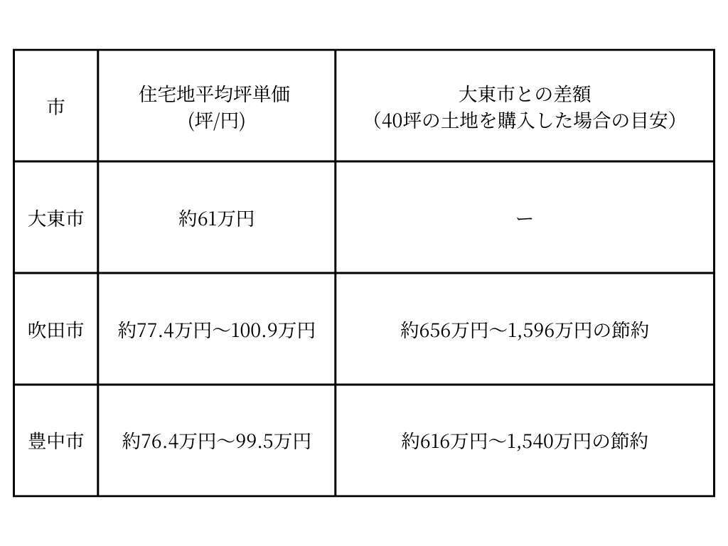 吹田市や豊中市と比較して、大東市では600万円以上、場合によっては1,500万円近くも土地取得費用を抑えられる可能性があるのです 。
